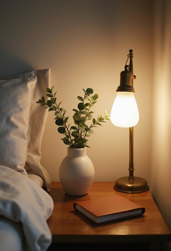 While your statement piece steals the show, don’t sleep on the real MVP—a quality bedside lamp. You need light that actually works, not some flickering disaster that makes you squint like you’ve forgotten your glasses. Pick a lamp with a warm glow (think 2700K color temperature) that won’t blast your eyeballs at midnight. A 60-watt equivalent bulb does the trick without turning your bedroom into an interrogation room. Position it on your nightstand’s far corner so it doesn’t bonk your head when you’re reaching for water at 3 a.m. Look for adjustable brightness if you’re fancy. Brass, ceramic, or wood bases match most styles and won’t look totally out of place. Your eyes will thank you, seriously.