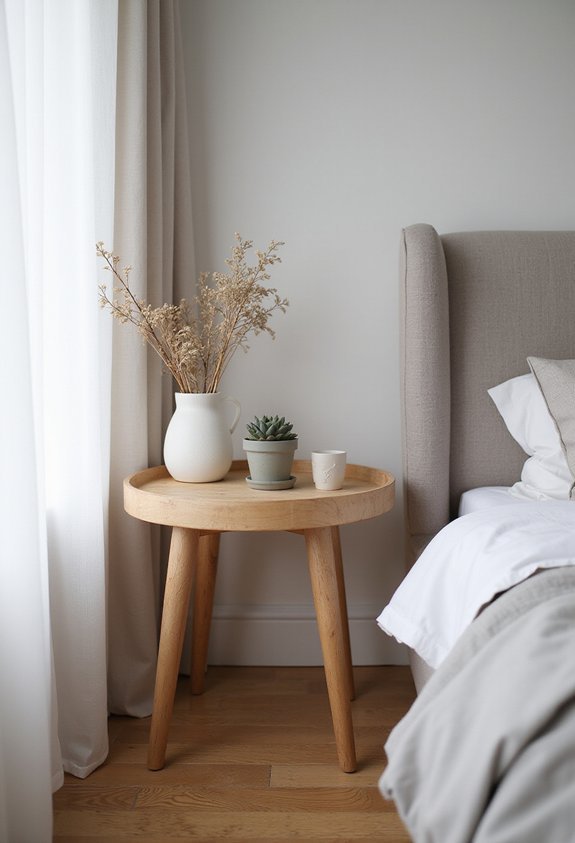 Why do all your furniture corners keep attacking your shins like tiny wooden ninjas? Curved and rounded side tables are your answer! These smooth operators feature gentle, flowing edges instead of sharp corners that bruise your legs. You’ll find them in soft cream, warm walnut, or sleek black finishes. They’re typically 24 inches tall and 18 inches wide—perfect for tucking next to your bed without taking up tons of space. The curved design makes your bedroom feel softer and more welcoming. Plus, you can actually walk past them without wincing in pain. Your shins will thank you. These tables work great for holding lamps, books, or that glass of water you’ll definitely spill at 2 a.m.