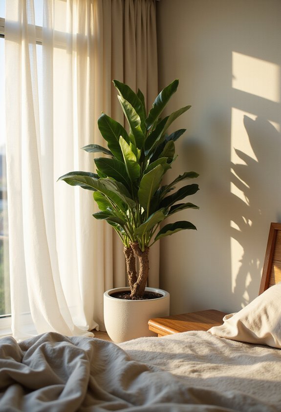 the Corn Plant is basically a forgiving friend who doesn’t judge you for forgetting their birthday. This tropical beauty grows 4-6 feet tall and features stunning yellow-striped green leaves that’ll make your bedroom pop. You can stick it in a corner and ignore it for weeks. Seriously, it thrives on neglect. It tolerates low light and irregular watering like a champ, though it prefers bright, indirect sunlight. Just don’t overwater it or you’ll turn its roots into a swamp. Position it near a window where it catches filtered rays. The variegated foliage adds serious style without demanding your constant attention. If you can’t keep a plant alive, the Corn Plant won’t hold it against you. It’s that dependable.