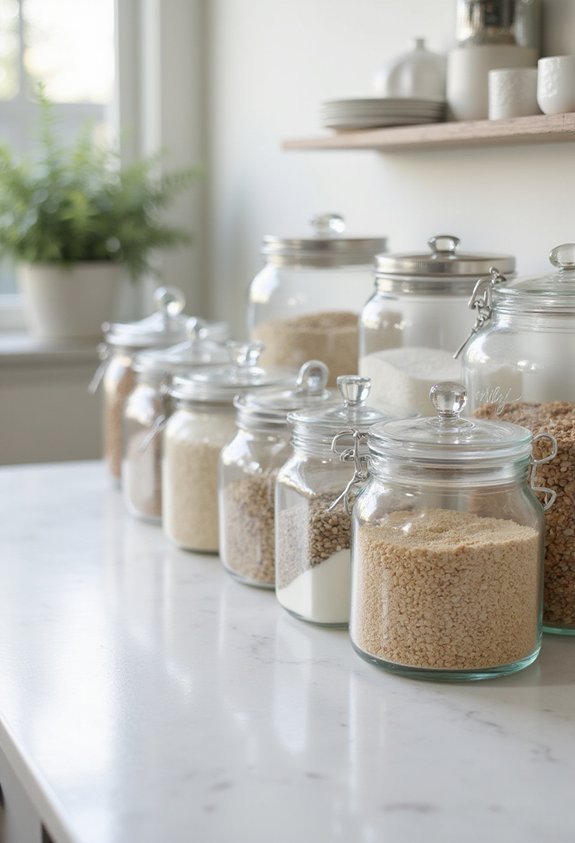 If you’re drawn to contemporary kitchen design, glass canisters offer an ideal solution that combines aesthetic appeal with practical functionality. You’ll appreciate how they showcase your pantry’s contents, creating visual interest while maintaining a clean, minimalist aesthetic.