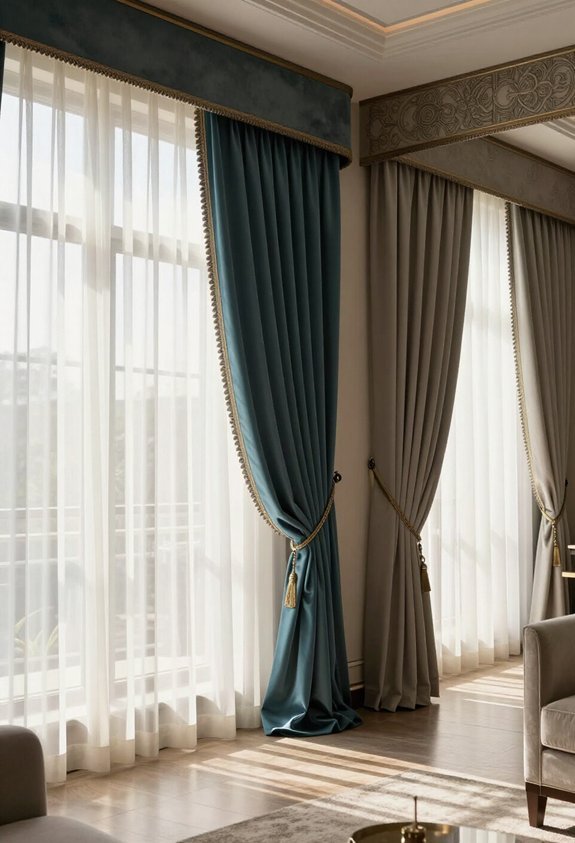 Emerald, sapphire, and amethyst—these aren’t just fancy names for your grandmother’s jewelry box anymore. They’re your living room’s new best friends. Jewel tone drapes transform any space into something downright luxurious. Think deep purples, rich blues, and stunning emerald greens draped floor-to-ceiling. These bold beauties demand attention like a peacock at a party. Your guests won’t be able to ignore them, and honestly, that’s the whole point. They pair wonderfully with neutral walls and warm lighting. Hang them high—around 84 inches tall—to elongate your windows and make your room feel fancy-pants fancy. Yes, they’re bolder than playing it safe with beige. But aren’t you tired of boring? Jewel tones say you’ve got taste and aren’t afraid to show it.