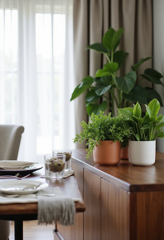 You’ll want to position plants near your dining room’s windows for indirect light. If you’re short on natural light, you can supplement with LED grow lights placed 6-12 inches above foliage. Low-light plants like pothos and snake plants thrive without direct sun.