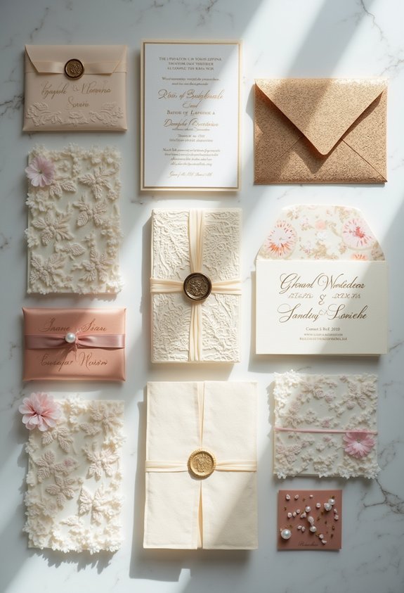 Delicate lace patterns paired with lustrous pearls transport your invitations straight into heirloom territory. You’ll want to layer ivory doily overlays atop cardstock, securing them with pearl-tipped pins at each corner for dimensional elegance. Opt for genuine 4mm freshwater pearls rather than plastic alternatives—they catch light beautifully and photograph exceptionally well.