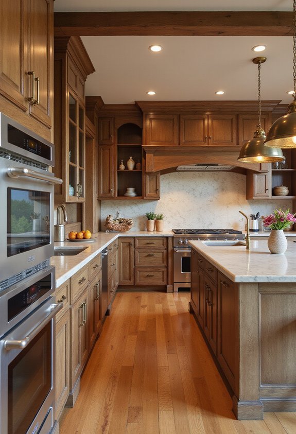 Many homeowners find that a single kitchen layout doesn’t fully address their needs, which is where hybrid approaches shine. You can combine the efficiency of a galley kitchen with the social appeal of an open-concept design by using strategic placement of islands or peninsulas. Alternatively, you might merge a U-shaped layout’s storage capacity with an L-shaped kitchen’s accessibility. Hybrid kitchens work especially well in homes with unconventional spaces or multiple functional requirements. You’ll benefit from increased flexibility when entertaining while maintaining dedicated prep zones for cooking. The key is identifying which layout elements serve your lifestyle best, then blending them seamlessly. This customized approach guarantees your kitchen supports both daily routines and entertaining goals without compromising either.