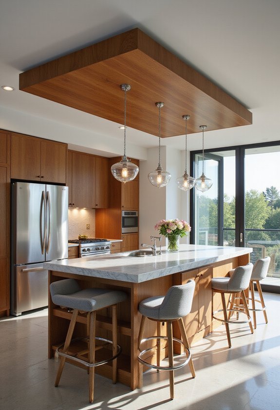 A waterfall island combines elegance with functionality by featuring countertops that cascade down one or more sides, creating a stunning visual effect while maximizing usable surface area. You’ll appreciate how this design adds architectural interest to your kitchen while maintaining practical workspace.