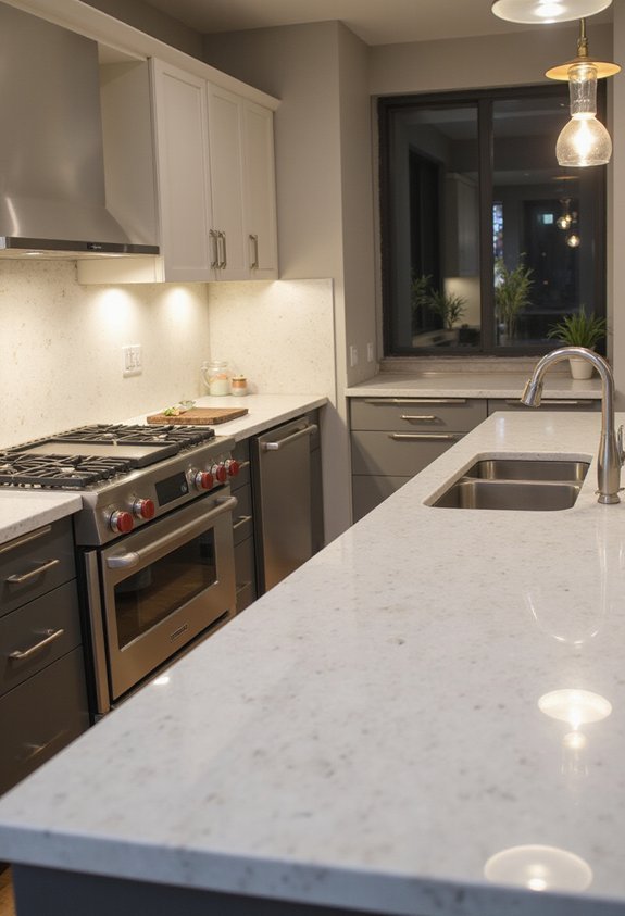 Install your countertops at least 18 inches from your hob’s edge, and always use trivets or heat-resistant mats for added protection. This strategic placement and material selection guarantees your countertops remain beautiful and functional for years.