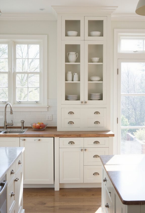 You’ll appreciate how light wood tones brighten your kitchen and pair beautifully with white cabinetry and neutral walls. Butcher block offers durability and functionality, developing a rich patina over time that adds character and authenticity.