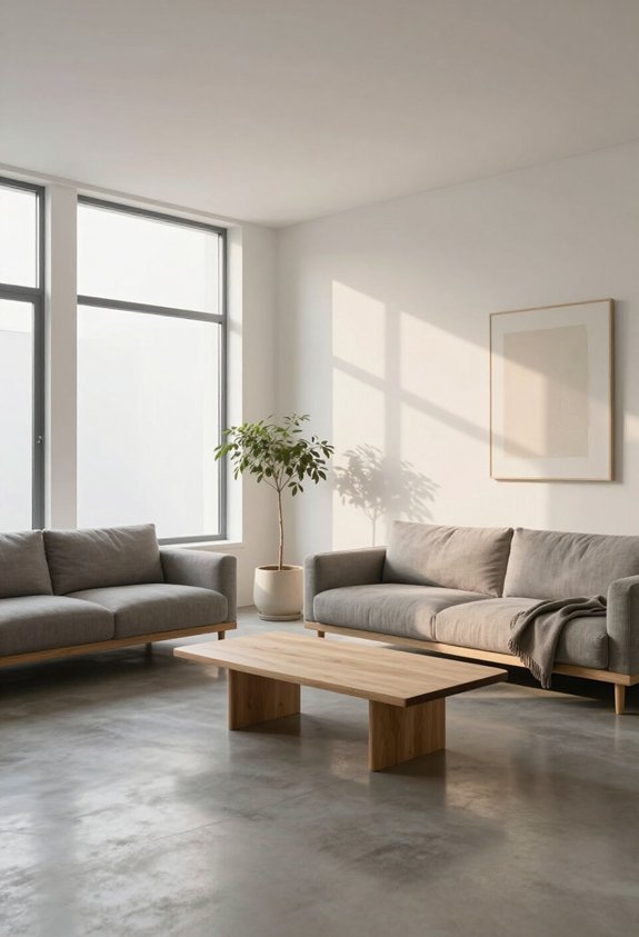 You’ll warm up your minimalist living room by incorporating soft textures like throw blankets and area rugs, adding ambient lighting through lamps, and displaying personal photos or meaningful artwork. You’re creating intentional coziness without cluttering your space.