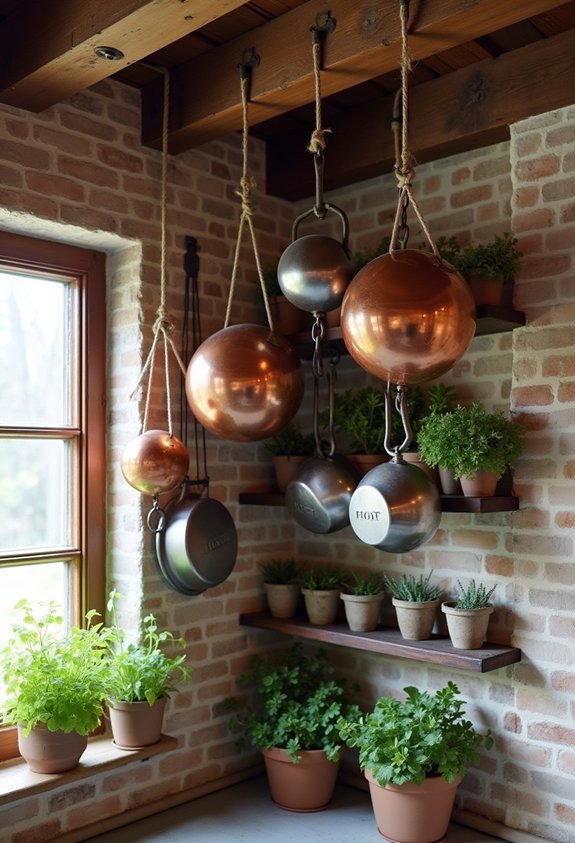 Whether you’re working with limited funds or prefer customized solutions, you can create functional pot hanging systems using affordable materials you might already have at home. Repurpose wooden dowels, metal rods, or sturdy branches as hanging bars. Attach them securely to wall studs using heavy-duty brackets or industrial-strength hooks. For hanging apparatus, you’ll find S-hooks and chain at hardware stores for just a few dollars. Old rope or paracord works excellently for rustic designs. Paint or stain your materials to match your kitchen aesthetic. Consider pegboard installations for maximum flexibility—you can rearrange hooks whenever you’d like. Start small with just a few pots and expand gradually as your budget allows. These DIY approaches deliver professional-looking results without expensive installations.