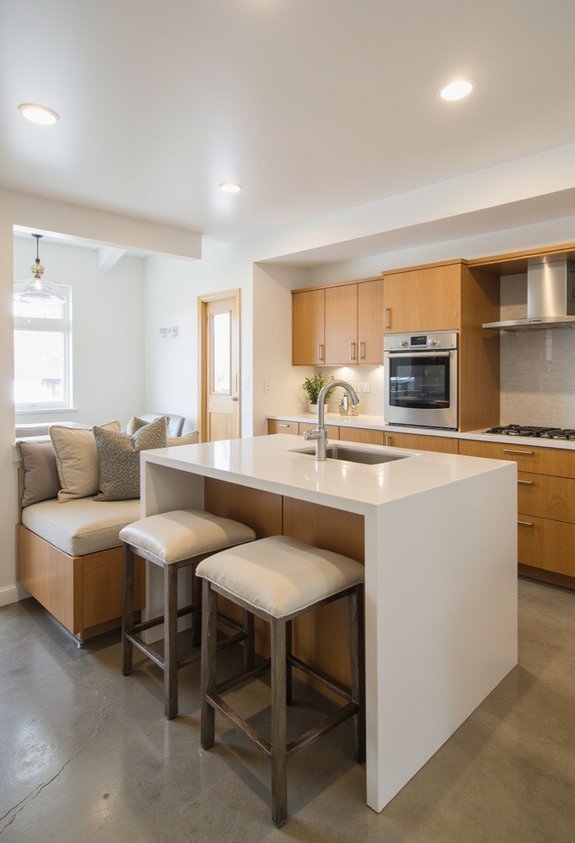 Because banquettes maximize corner spaces that’d otherwise go unused, they’re ideal for small kitchens. You’ll appreciate how these built-in benches transform underutilized areas into functional seating that doesn’t demand floor space like traditional chairs do.