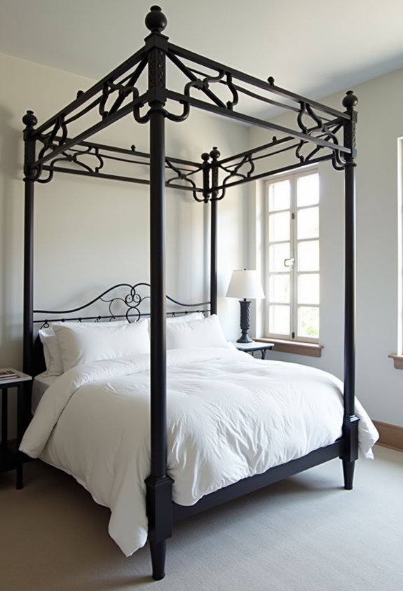 When it comes to black frame canopy beds that embody contemporary design, metal construction reigns supreme. You’ll find clean lines and geometric shapes define this aesthetic perfectly. Powder-coated steel frames measuring 1-2 inches thick create striking silhouettes without overwhelming your space.
