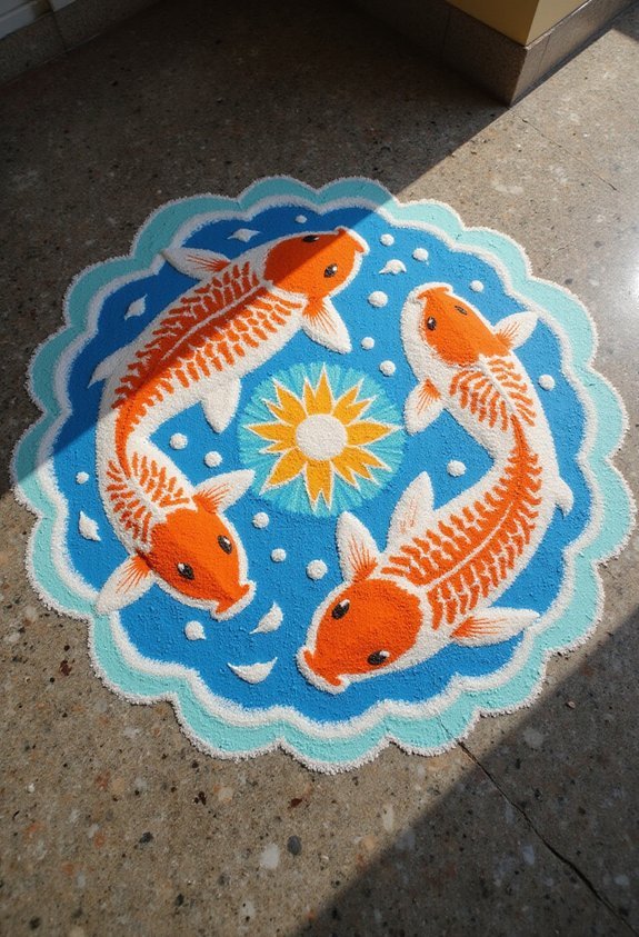 Traditional pulli kolam techniques elevate your koi design when you incorporate sacred dot patterns around a mirror-image fish pair. You’ll place dots in precise geometric grids, typically 9×9 or 11×11 formations, then connect them with flowing koi outlines facing opposite directions. The symmetry creates visual balance that’s perfect for entryways measuring 4-6 feet wide.