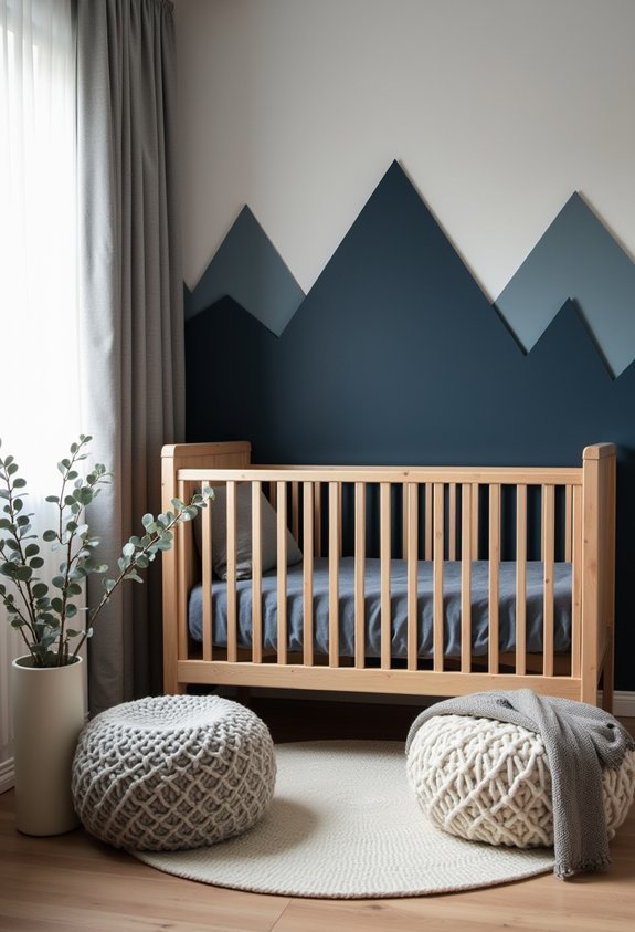 While stripes offer geometric precision, mountain range murals bring organic movement to your nursery walls. You’ll create depth using soft grays, sage greens, and dusty blues that won’t overwhelm your baby’s developing vision.