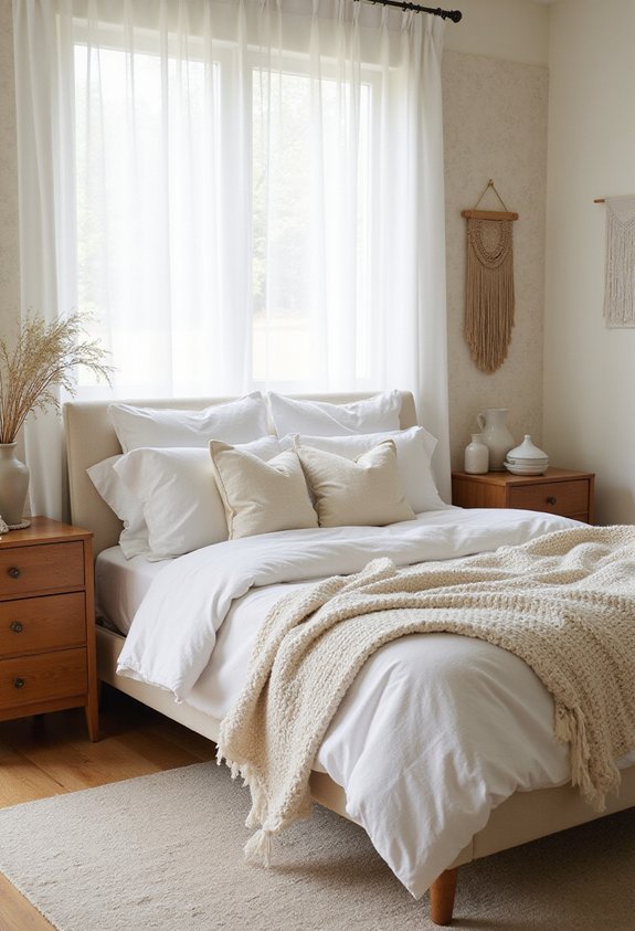 Since you’ve established a sophisticated aesthetic with layered textures, you’ll want bedding that complements your design while prioritizing comfort and functionality. Linen and cotton are your ideal choices for a white bedroom.